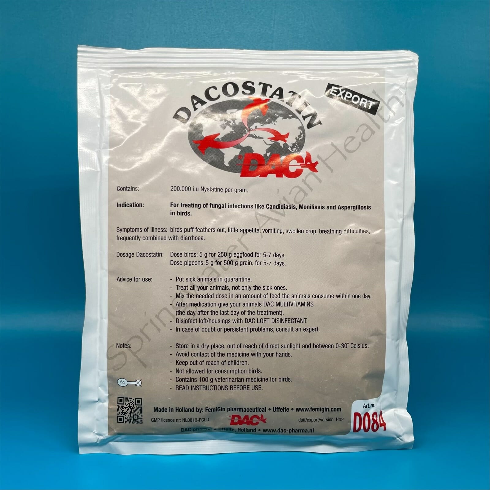 DAC Dacostatin is an anti-fungal product that can be mixed in with your pigeons, other birds feed or mixed with a bit of water and given orally with a syringe. Nystatin is the active ingredient. This highly effective antifungal works best when it has direct contact with the location of yeast/fungal activity making it very useful for sour crop. It is often used with an antiprotozoal medication. (ex. Metronidazole).Â