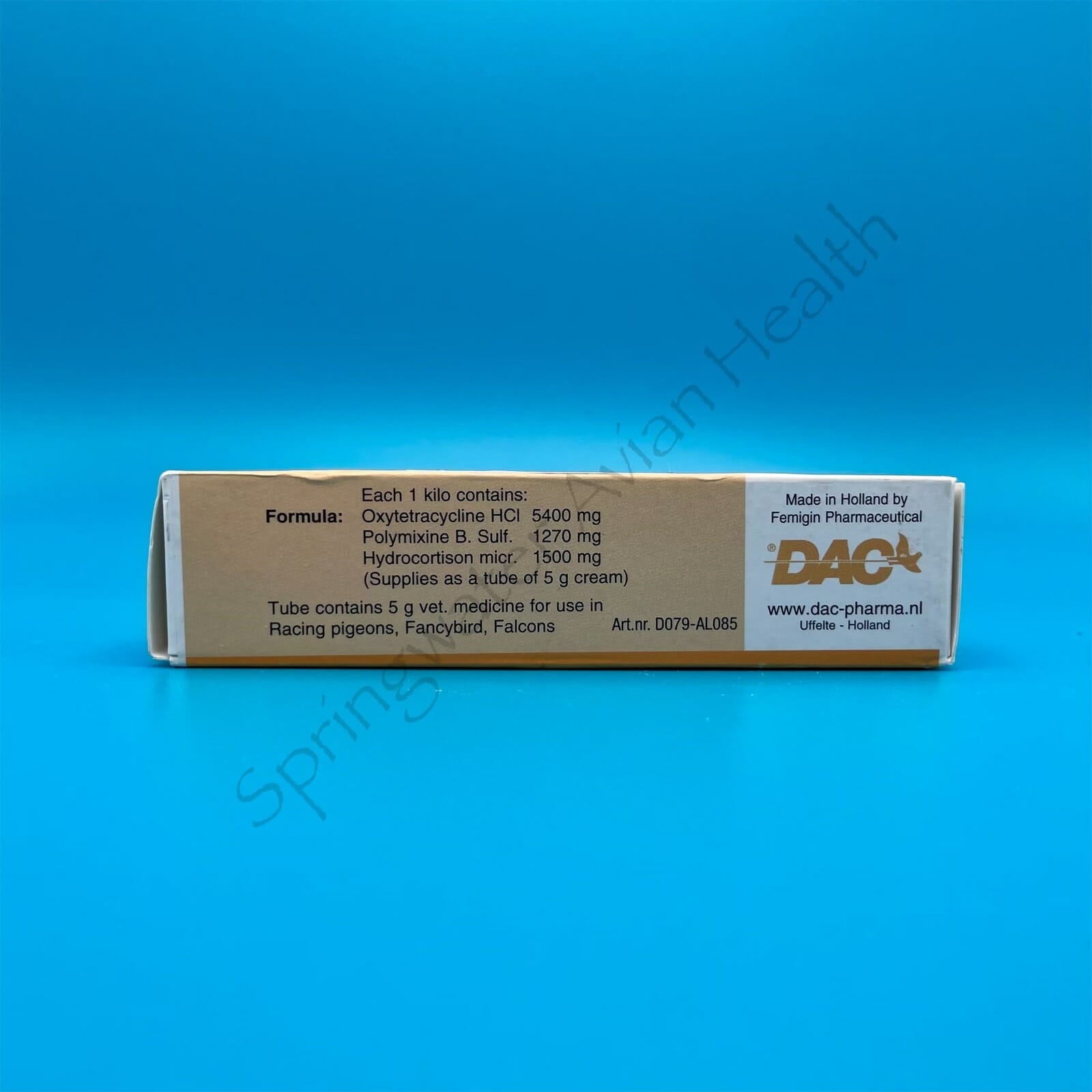 DAC Eye and Ear Cream is a soothing and healing ointment that combines two antibiotics and an anti-inflammatory medication to treat wounds and infections in both eyes and ears. Anti-inflammatory action helps reduce inflammation providing relief for your bird. Please follow manufacturers instructions as this product contains a steroid (anti-inflammatory). Product is labeled for pigeons, raptors and cage birds.