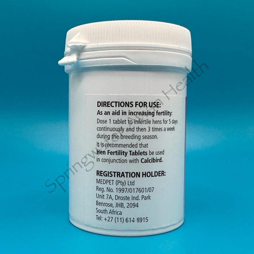 Medpet Hen Fertility Tablets are oral tablets to use to help increase fertility in female birds before and during breeding seasons. Hen Fertility tablets contain Vitamin E and Magnesium Sulfate. Magnesium Sulfate is essential to nerve and muscle cellular metabolism.