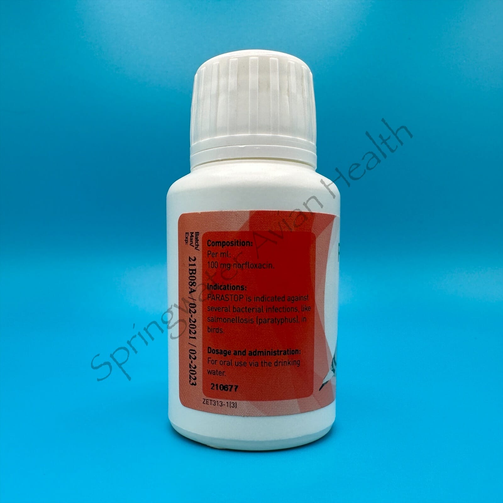 Pantex Parastop is an oral antibiotic solution containing norfloxacin. This product can be added to the drinking water or dosed by weight and given orally. Norfloxacin is used in severe bacterial infections, such as salmonella, campylobacter, e.coli, haemophilus, pasteurella, and mycoplasma in birds. Effective against both gram-positive and gram-negative bacteria.