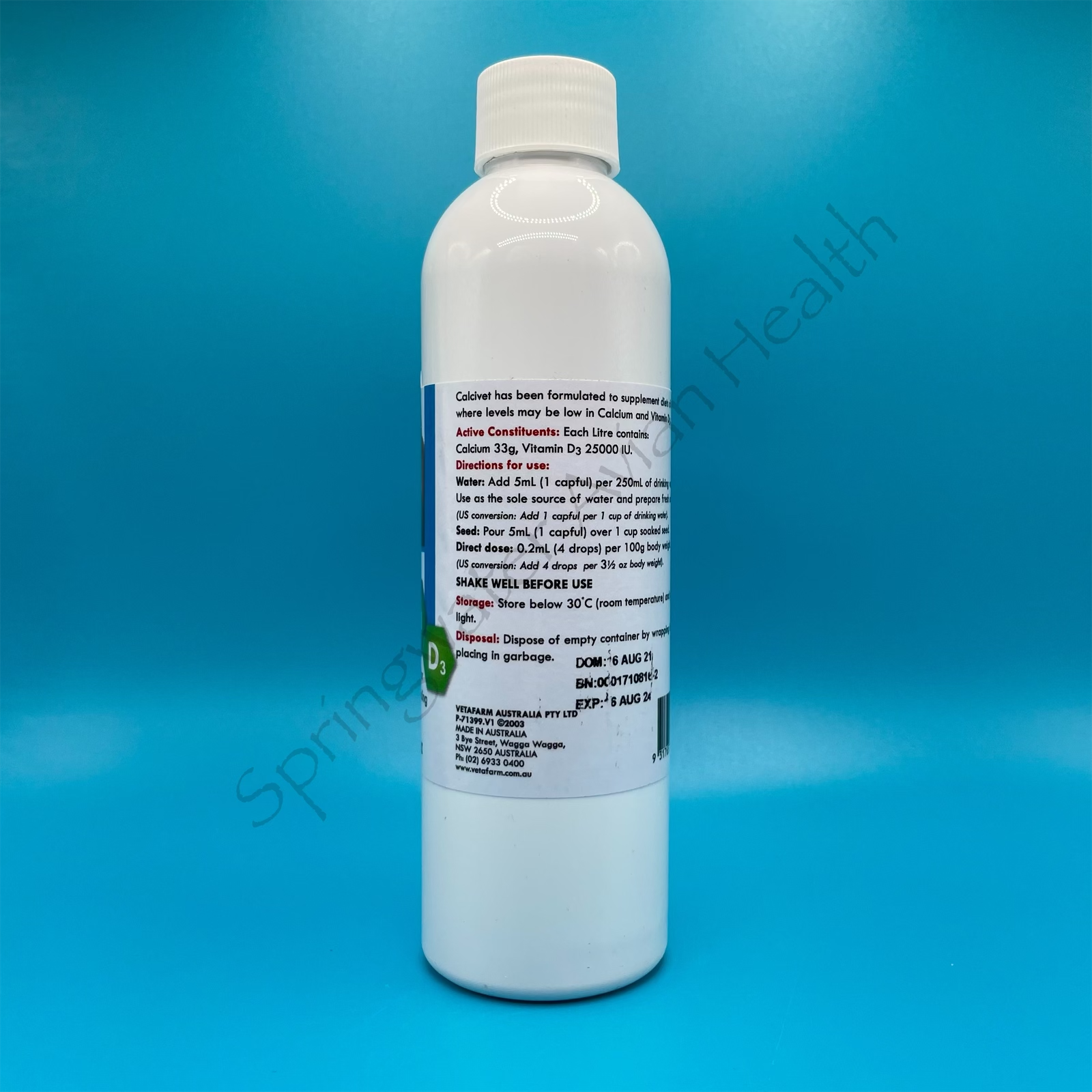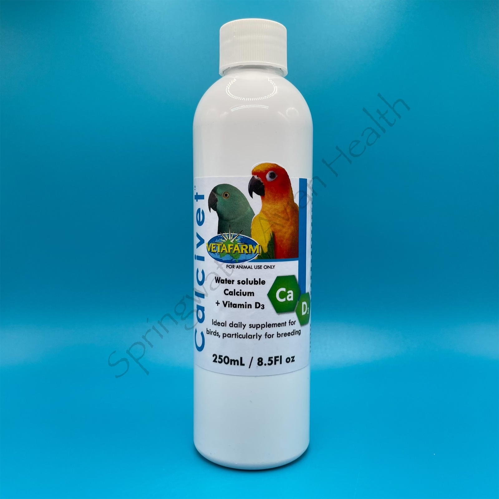 Vetafarm Calcivet is a water soluble calcium supplement with vitamin D to increase bioavailability. It is easy to administer in water and is a great choice for needed calcium when dealing with egg binding or soft/thin shell eggs with your birds including pigeons, cage birds, parrots and chickens other poultry.