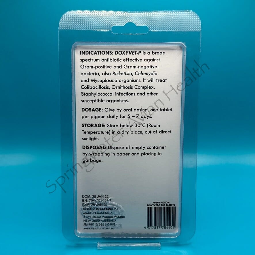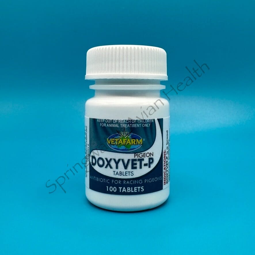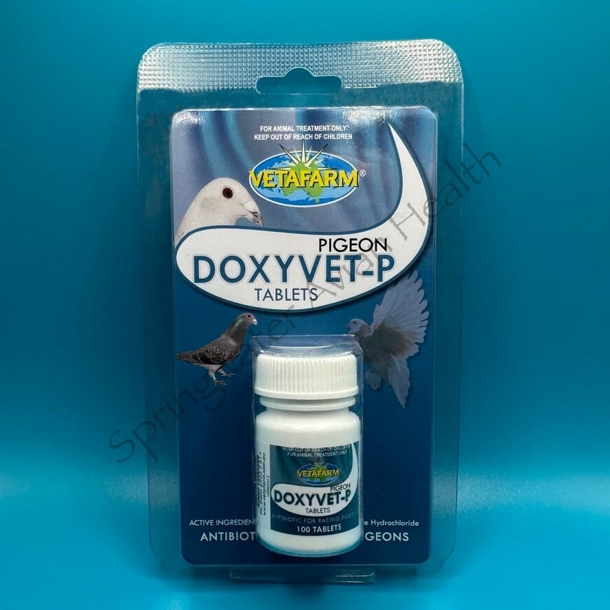 Vetafarm Pigeon Doxyvet-P Tablets contain the antibiotic doxycycline hyclate in a 25mg tablet for oral dosing in pigeons, pet birds and cage birds.Â